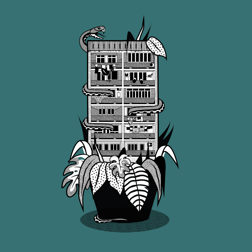 Whilst stuck at home during quarantine, I drew a couple of the soviet buildings from my street. Jungle style.