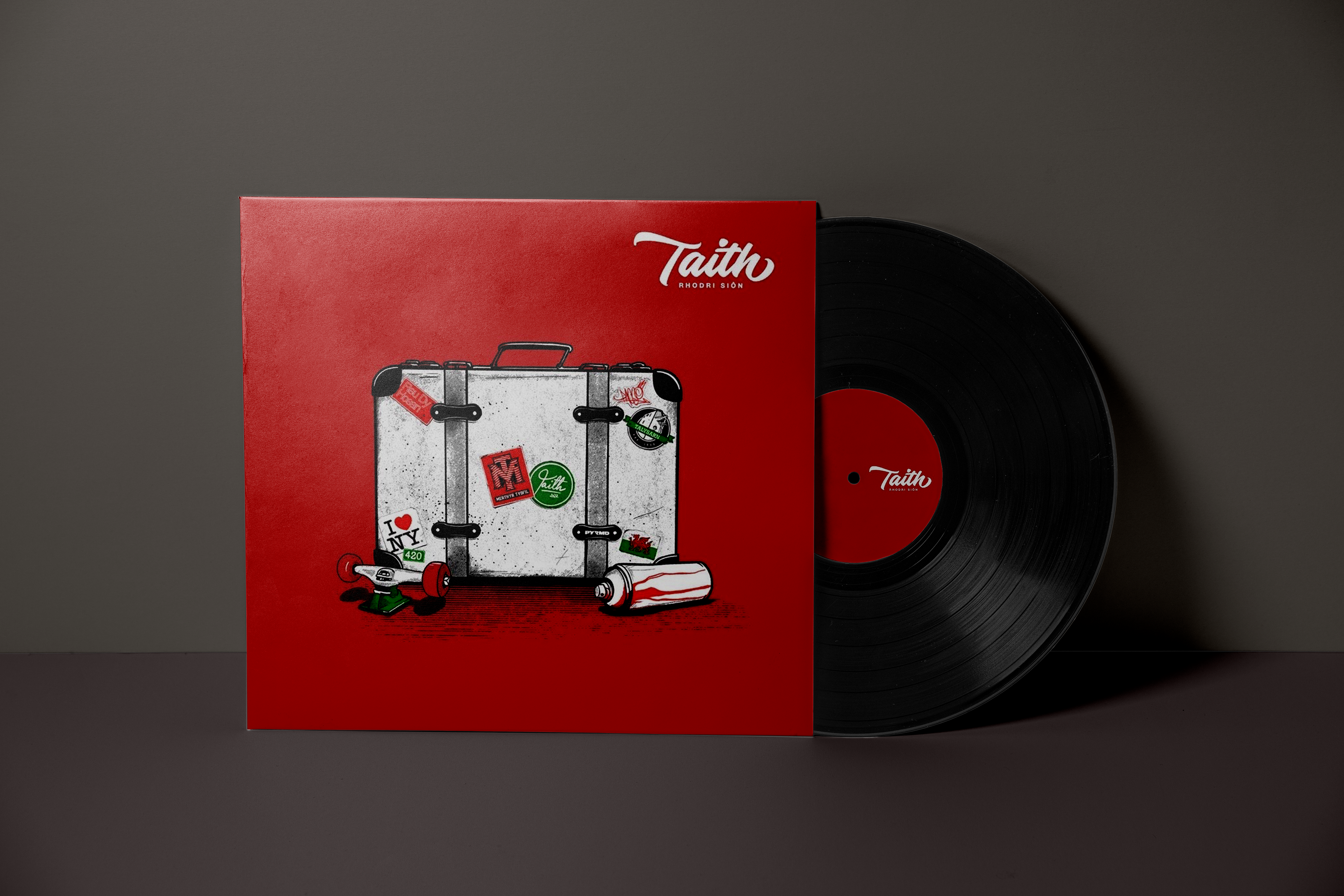 "Taith" is Welsh for "journey". The concept I chose for this record cover was a vintage suitcase with stickers that represented parts of the artists journey through life. The place he was born, graffiti, skateboarding and other easter eggs.